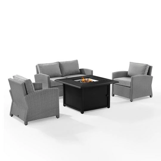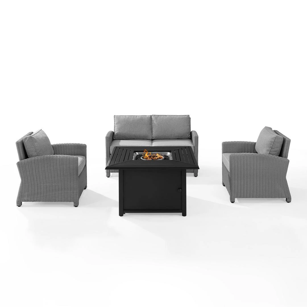 Spend warm summer days and cool summer nights with the Bradenton 4Pc Wicker Conversation Set. The loveseat and arm chairs are made from all-weather resin wicker with cushions covered in solution-dyed polyester. The outdoor seating surrounds a fire table constructed from sturdy powder-coated steel. The fire table’s slatted top and solid paneled base offer a simple design that blends with a variety of outdoor spaces. The gas controls and a rack for a propane tank are located inside the table’s base, keeping them close at hand but out of sight. You’ll be ready to relax in comfort with the Bradenton 4pc Wicker Conversation Set.