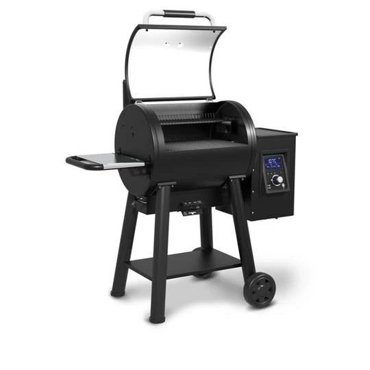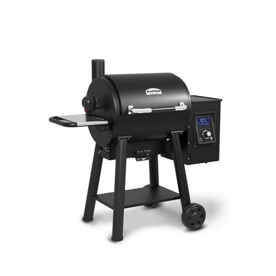 The Broil King Regal Pellet 400 pellet grill body is constructed from 2mm (14 gauge) steel, has 500 Sq.in. (3,226 Sq.cm.) of primary cooking surface, 130 Sq.in. (839 Sq.cm.) secondary cooking surface and heavy duty cast iron cooking grids. The Wifi and Bluetooth enabled digital controller provides enhanced temperature control to smoke, roast or sear. The controller display panel is the easiest to read while grilling, check the competition. This innovative product comes fully equipped with a powerful auger, 22-lb capacity pellet hopper, removable grease management system, unique ash management system, deluxe rotisserie kit, 2 electronic meat probes, and base storage and side shelf.