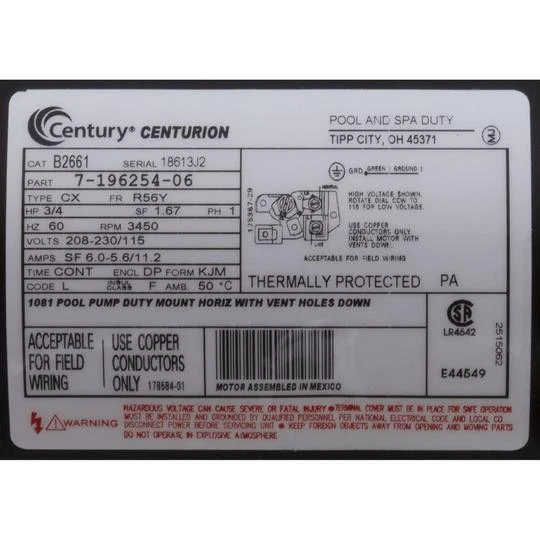 Century Pool Pump Motor, 0.75 HP, 115v/230v, 1-Speed, 56Y Frame, Square Flange, EE