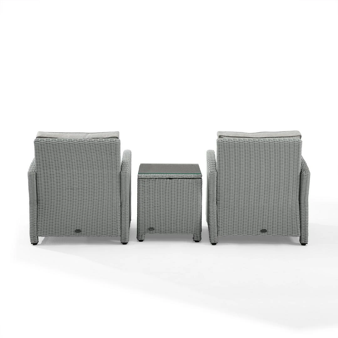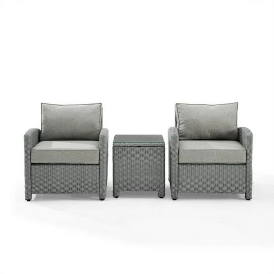 Outdoor relaxation has never looked better than with the Bradenton 3pc Chair Set. The sturdy steel frames are wrapped in beautiful all-weather wicker and topped with moisture-resistant cushions. With gently arched arms and deep seating, the Bradenton armchairs are stylish and comfortable, while the glass top side table makes outdoor entertaining a breeze.
