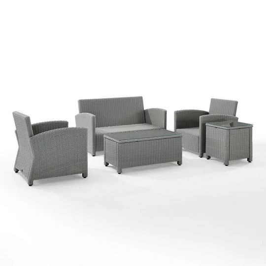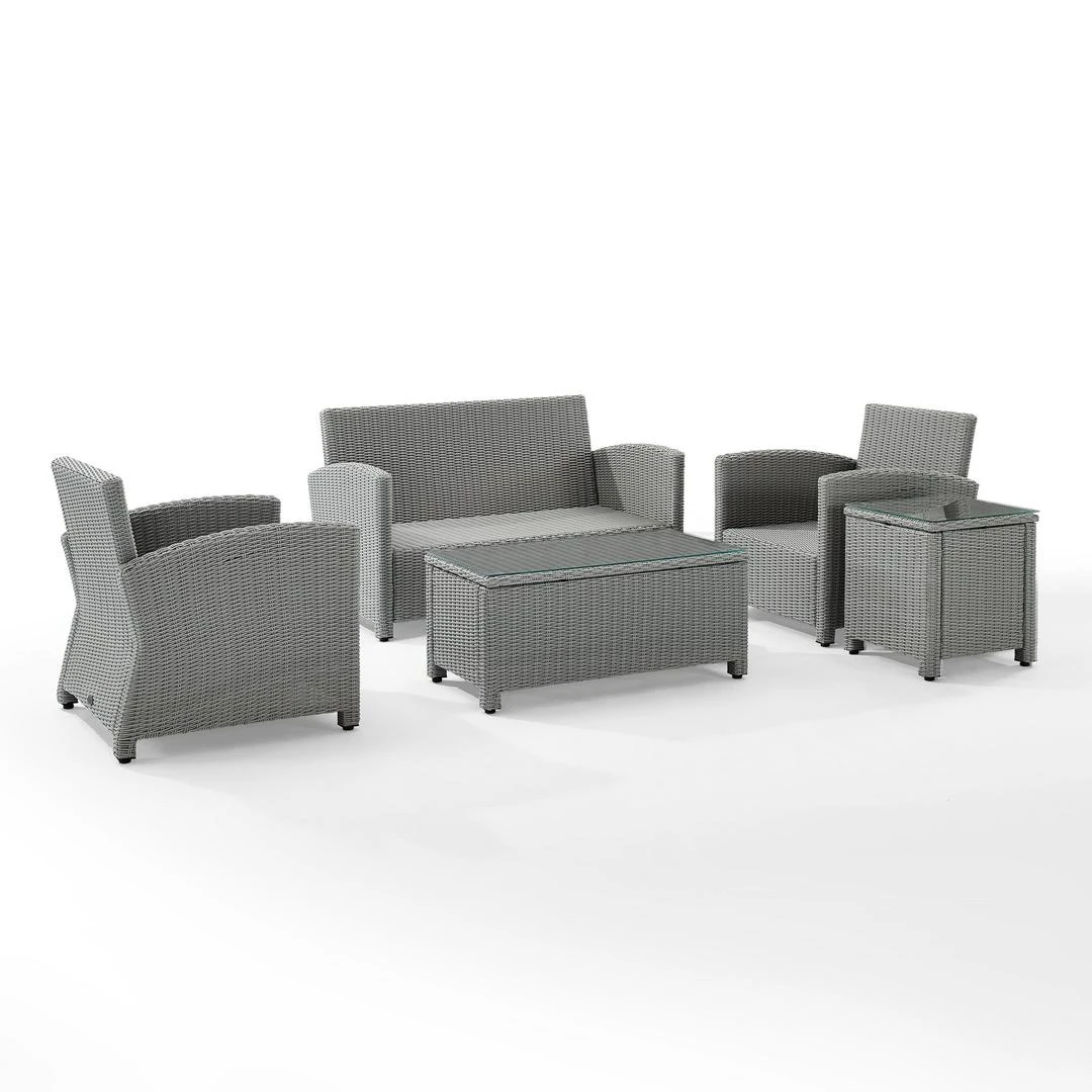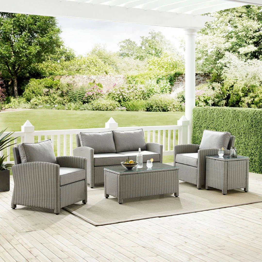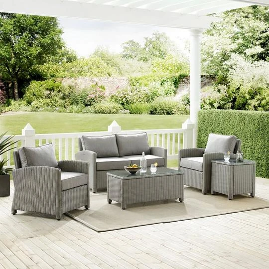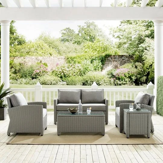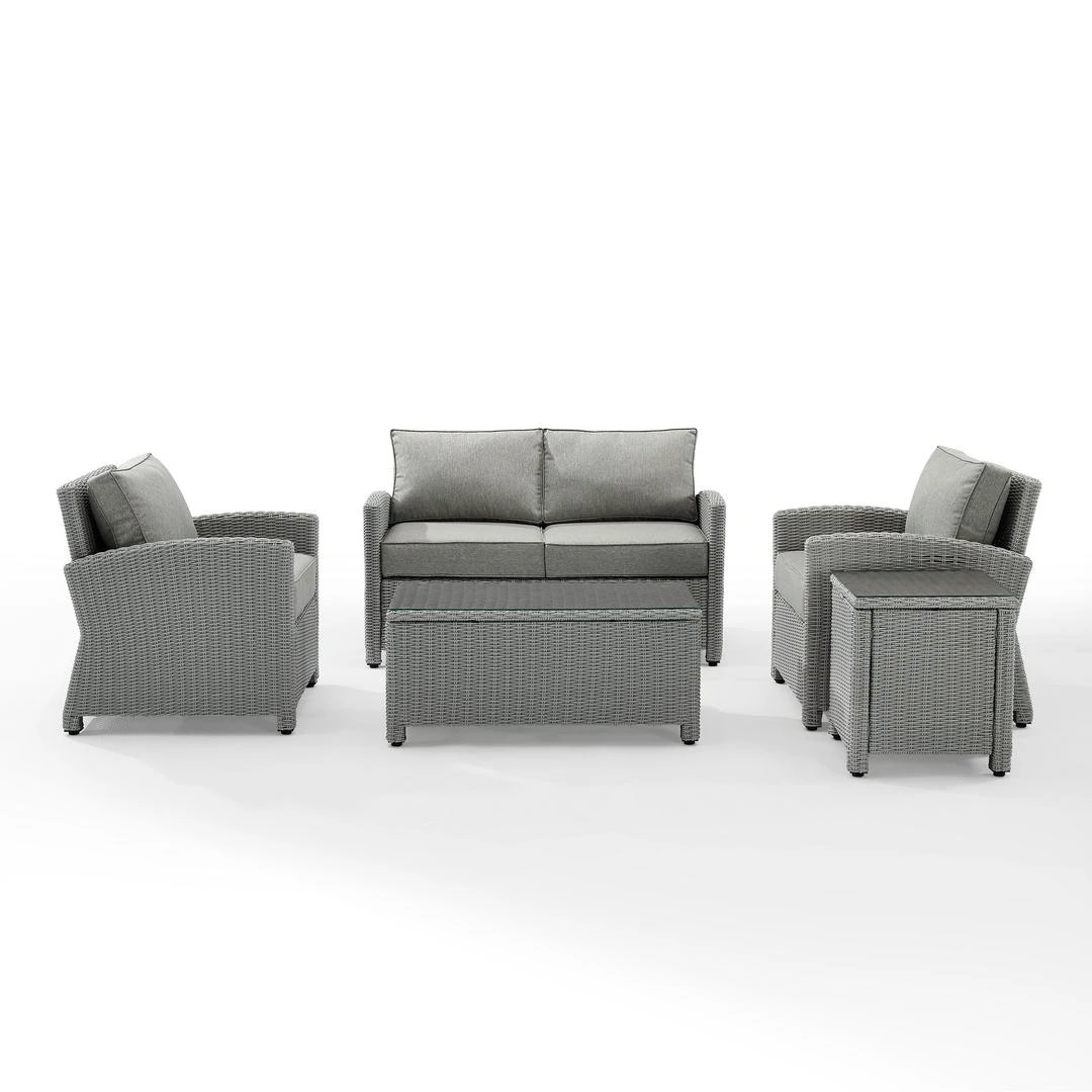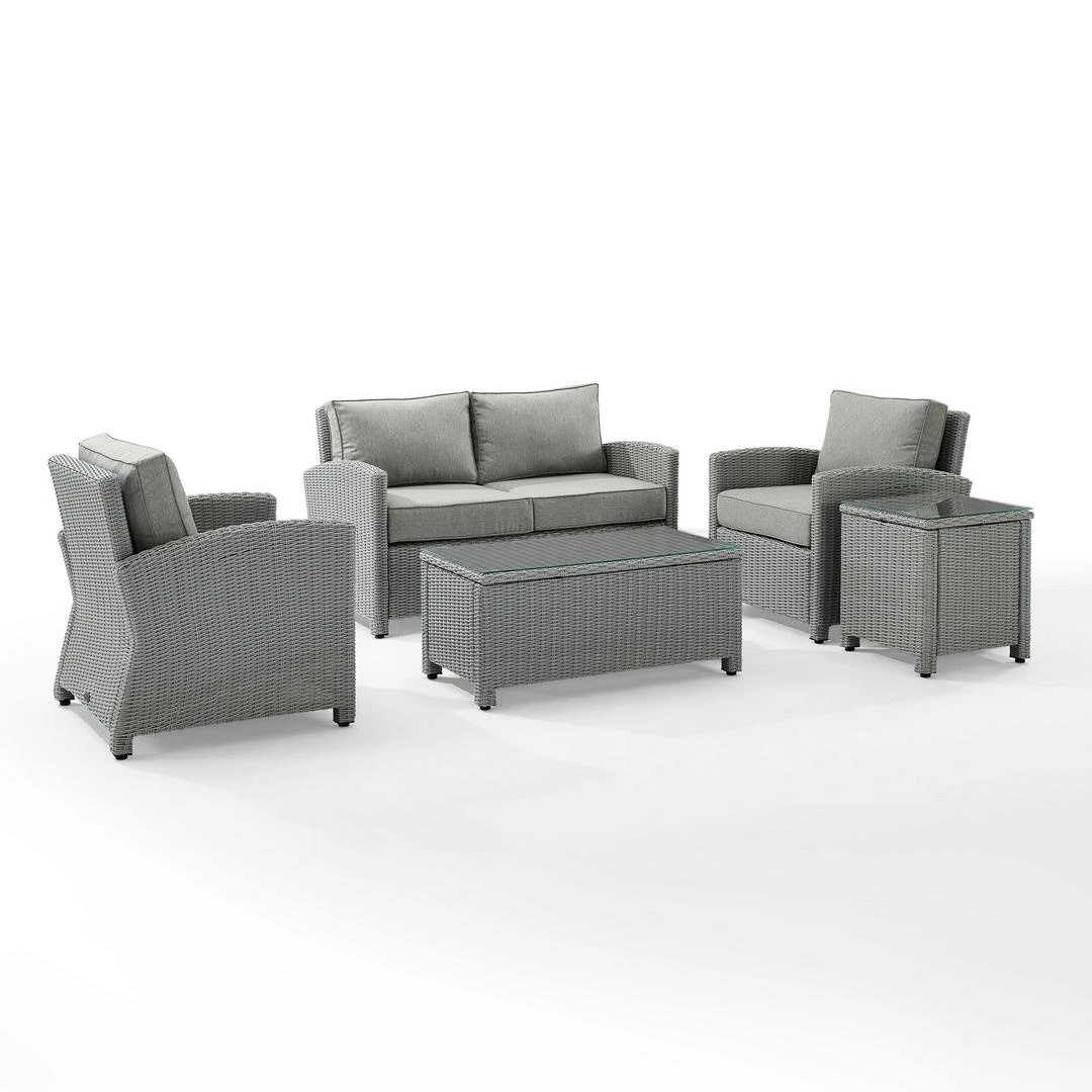 Gather with friends for an evening under the stars with the Bradenton 5pc Conversation Set. Each piece of the set features sturdy steel frames wrapped in beautiful all-weather wicker. The loveseat and armchairs are stylish and comfortable with gently arched arms and thick moisture-resistant cushions. A glass top coffee table and side table tie the whole seating arrangement together, making outdoor entertaining a breeze with the Bradenton conversation set.