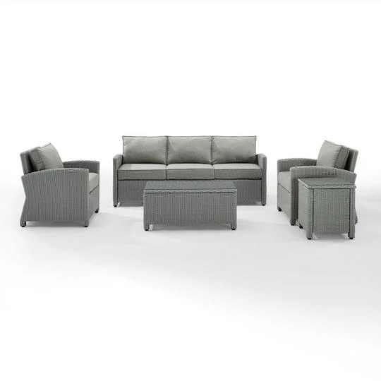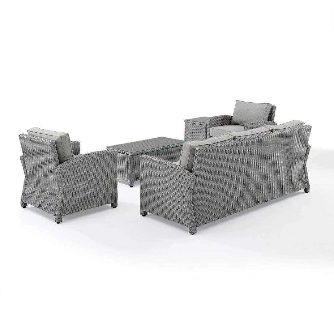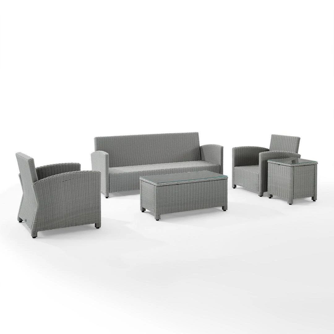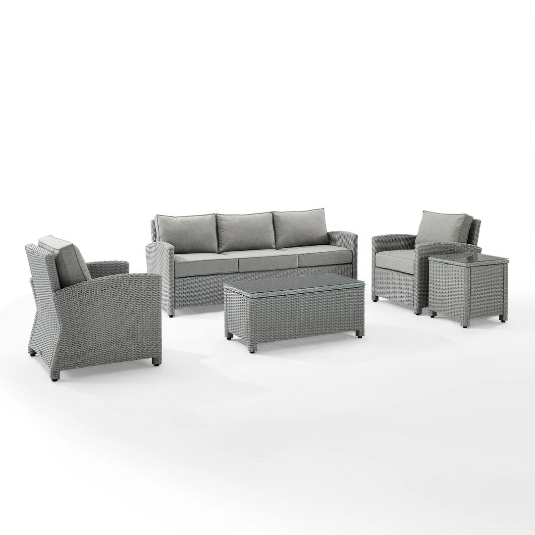 Gather with friends for an evening under the stars with the Bradenton 5pc Sofa Set. Each piece of the set features sturdy steel frames wrapped in beautiful all-weather wicker. The sofa and armchairs are stylish and comfortable with gently arched arms and thick moisture-resistant cushions. A glass top coffee table and side table tie the whole seating arrangement together, making outdoor entertaining a breeze with the Bradenton conversation set.