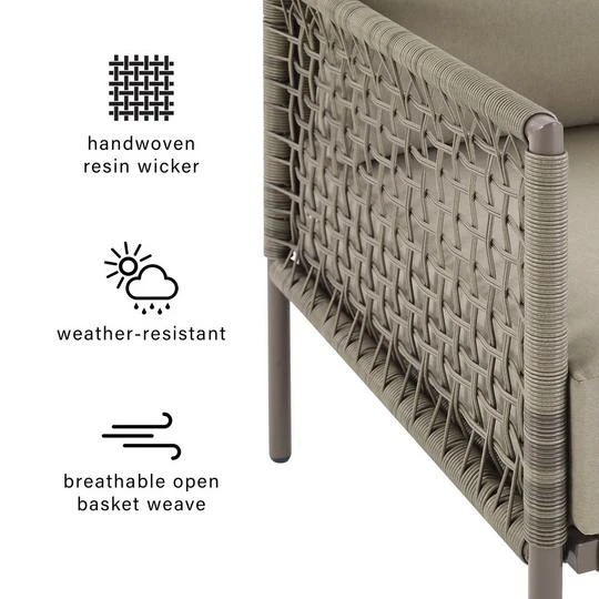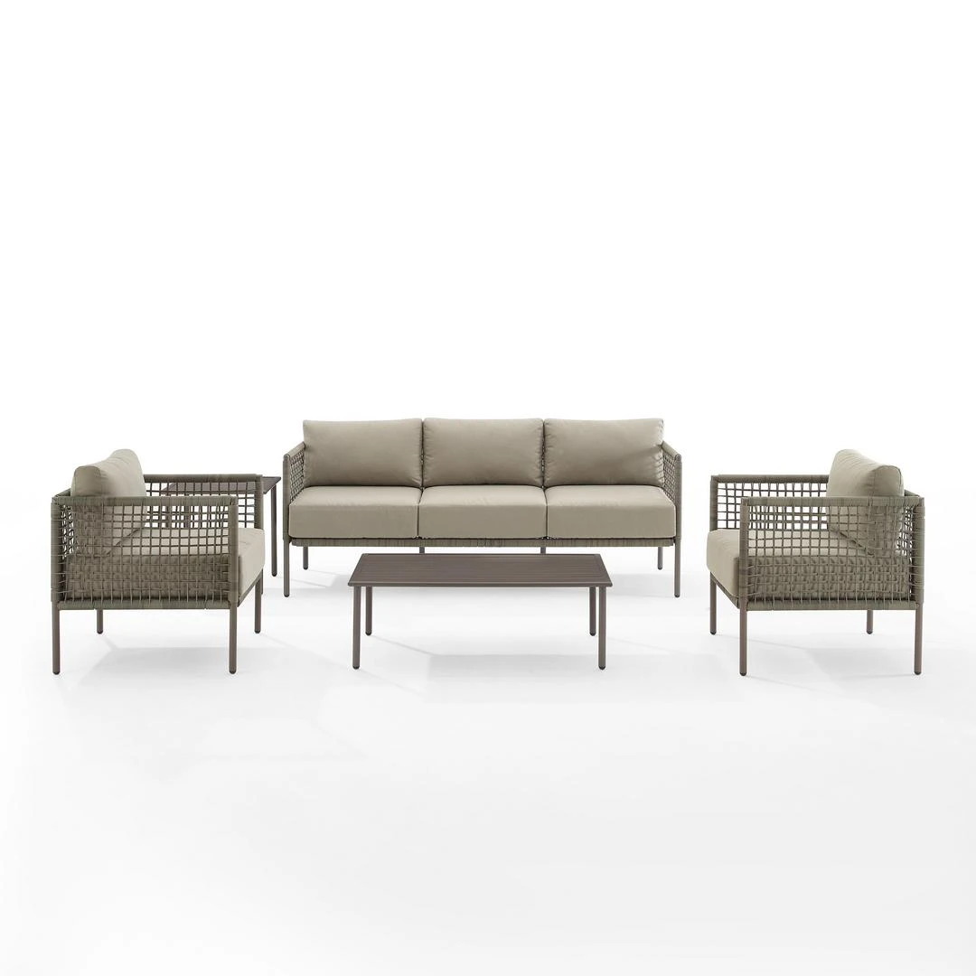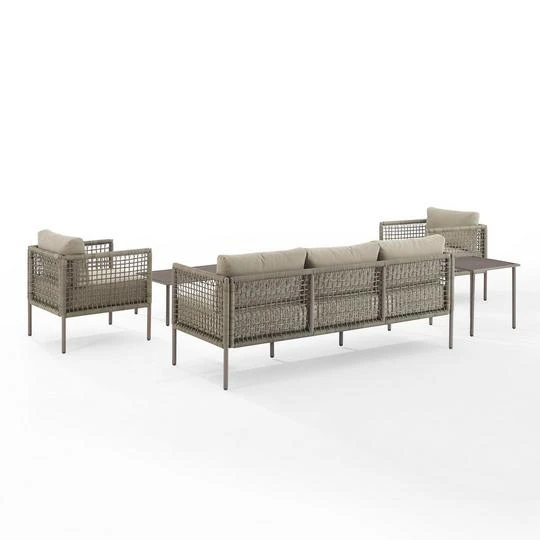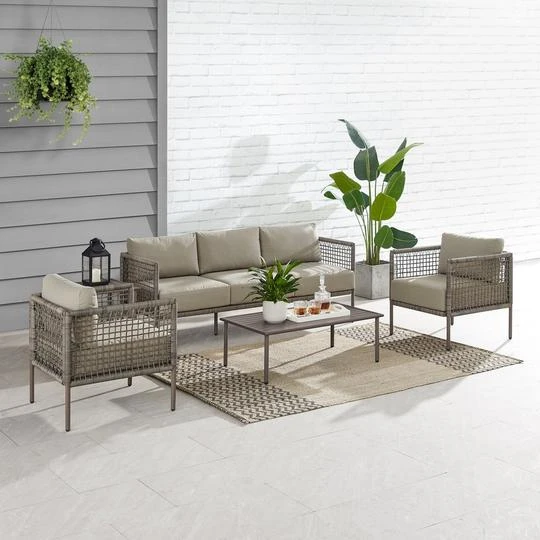Crosley Cali Bay 5-Piece Outdoor Wicker and Metal Sofa Set includes: Sofa, Coffee Table, Side Table, and 2 Armchairs. Bring a laid-back west coast vibe to your outdoor oasis with the Cali Bay 5pc Sofa Set. Featuring a modern silhouette covered with resin wicker in an open weave design, the sofa and chairs are sleek and breezy. The thick, cushioned seating is a perfect accompaniment to the large slatted steel coffee and side table, making the Cali Bay sofa set your favorite hideaway.