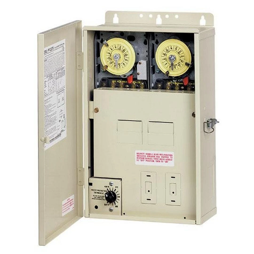 These heavy-duty Freeze Protection Controls are designed specifically for pools requiring one or two time switches and protect the pool and spa equipment and plumbing against freeze damage. They turn the pump and the heater ON when the outdoor temperature drops below the temperature set by the user-adjustable thermostat. In addition, they have a provision to install switches inside or GFCI receptacle on the side of enclosure.