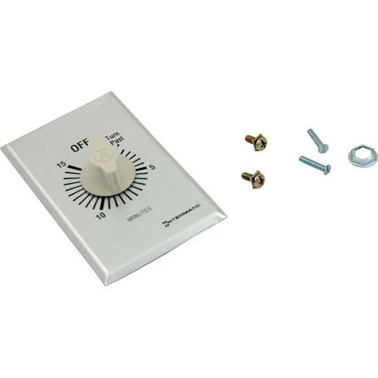 Intermatic wall mounted 15 minute spa blower or jet pump timer. Auto-Off Timer allows setting a time cycle of 4 minutes to a maximum of 15 minutes of run time for any appliance – pumps, blower, lights, fans, music. Timer switch is 120v, 20 amp, SPST. Brushed metal wall plate with minute increments and dial, fits into standard single gang wall box. Does not require power to operate, completely mechanical, but is wired into the device circuit as Normally Open. Switch closes when timer dial is turned, and opens again when time runs out. Primarily used as a blower timer switch, but works for any 120V device.
