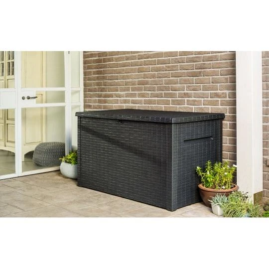 A great addition to any garden, the Java storage box provides an ideal solution to store larger items securely and maintain your outdoor living space clutter-free. Featuring an over sized design, the box will hold numerous items, from gardening tools and pool equipment to cushions and toys. The resin build makes the box weather-resistant, UV protected and maintenance free, while the surface’s stylish wicker texture s that Java will look great alongside any outdoor furniture. Designed with built-in handles and a piston opening system, the box is as convenient as it is elegant.